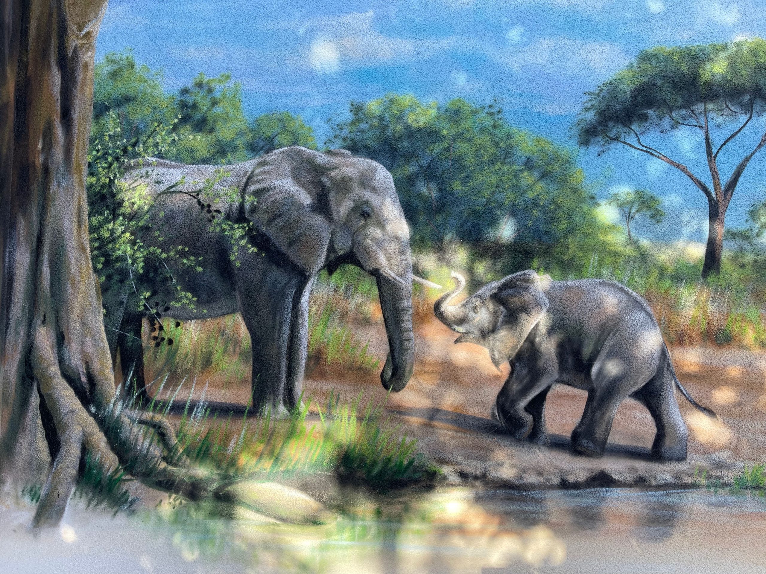 Schon von Weitem sieht man das wandfüllende Graffiti-Kunstwerk. Es zeigt eine vierköpfige Elefantenherde an einem Wasserloch, in Hintergrund ragt der schneebedeckte Kilimandscharo zwischen Wolken empor. An der nächsten Hauswand eine weitere Szene: wieder mit Elefanten, im Vordergrund zwei Flamingos, auch diese gestaltet von der Potsdamer Firma ART-EFX.