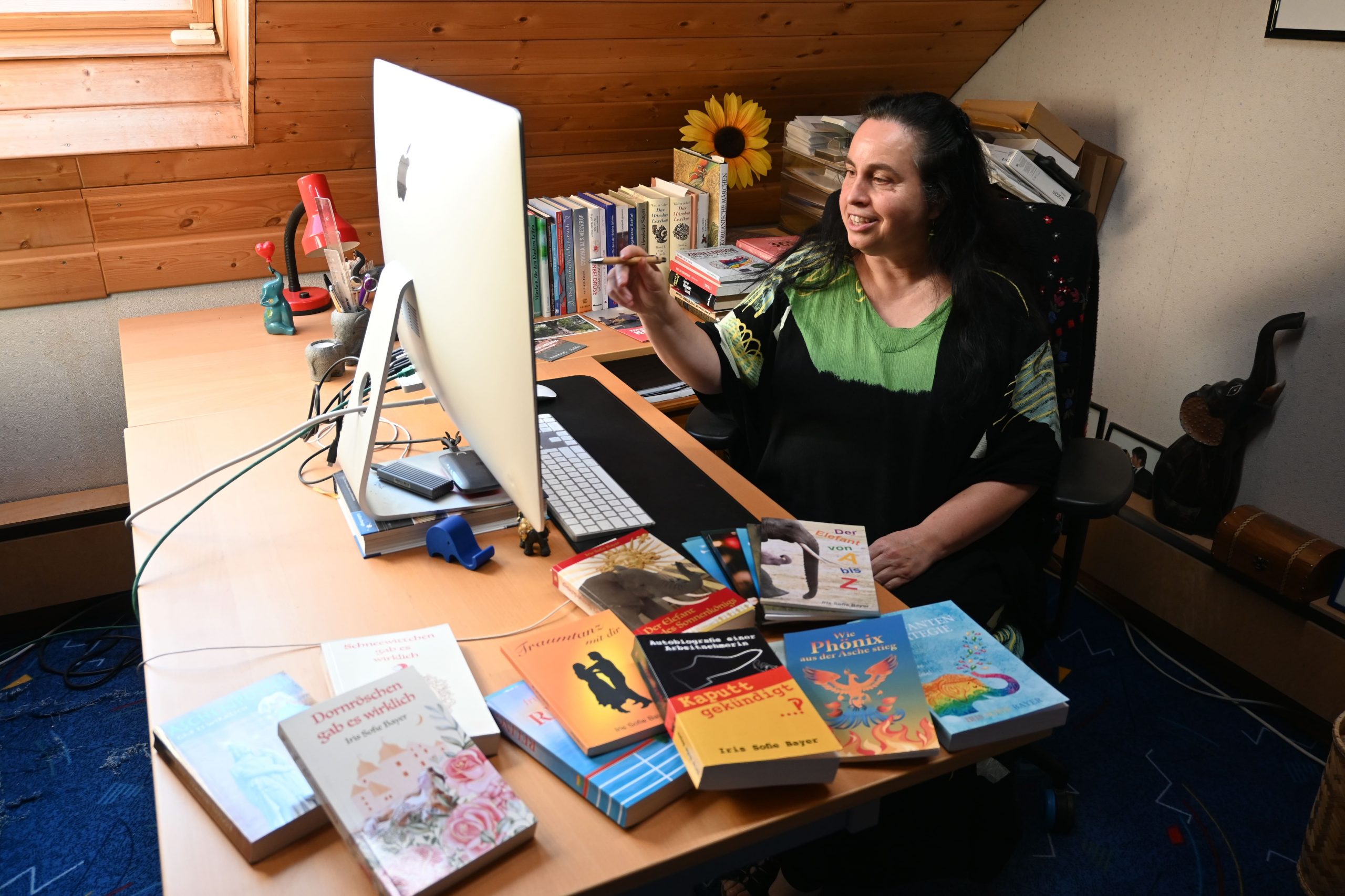 Die Glücksautorin mit ihren Büchern am Schreibtisch