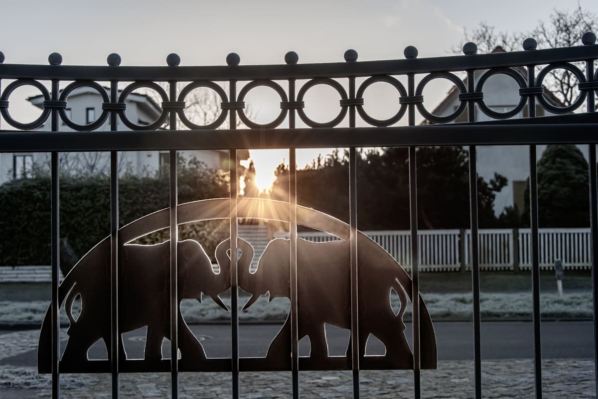 Es gibt noch mehr zu entdecken. Wer sich dem Haus nähert, erkennt, dass durch den Vorgarten steinerne Elefanten marschieren. Selbst die Klingel trägt den Umriss eines Elefanten, ebenso wie der Gartenzaun: Ihn schmückt das von Iris Sofie und ihrem Ehemann Oliver gemeinsam entworfene Logo – zwei Elefanten, die sich mit erhobenen Rüsseln begrüßen.